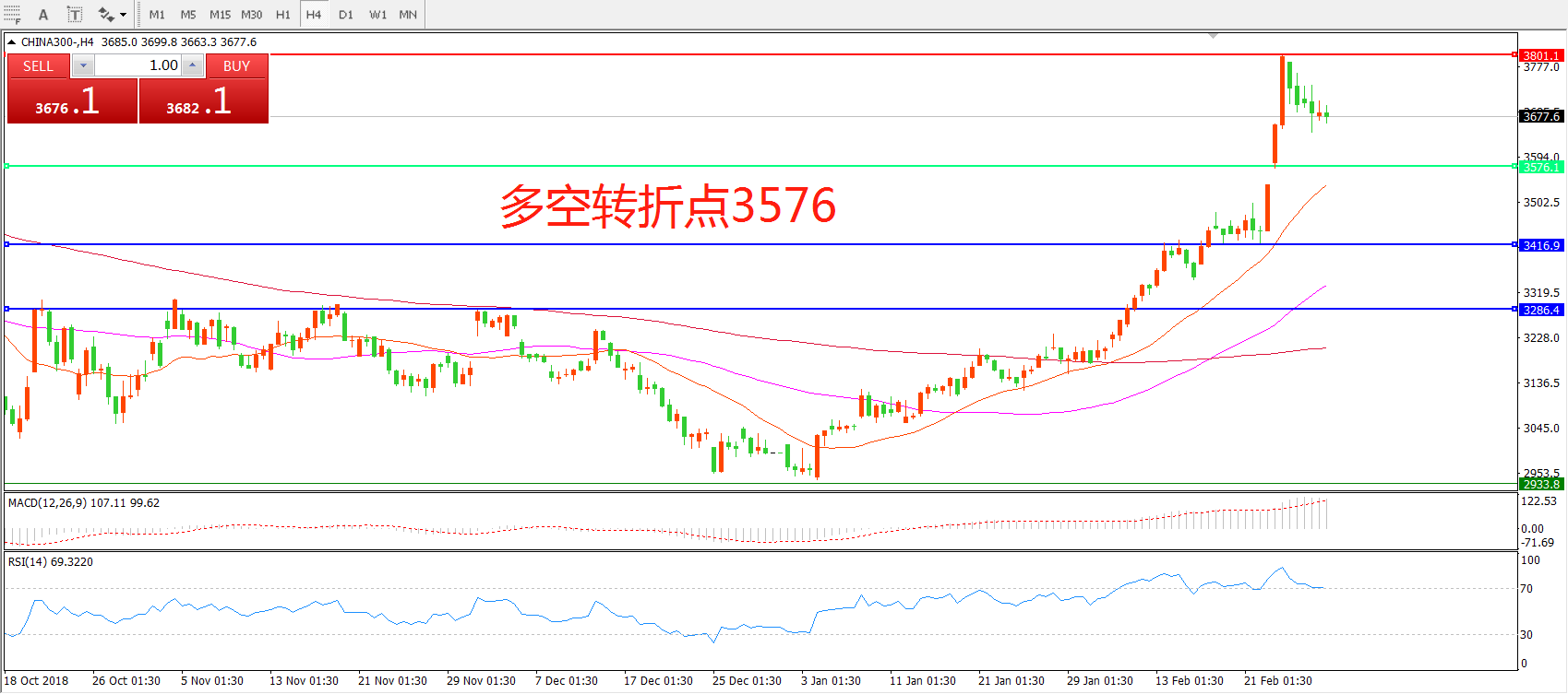 4小时图看,CHINA300中华指数触及上方3800一线出现回落,短期处于调整,但大方向依然向上,均线系统呈多头排列, MACD红柱增加,整体思路逢低做多。