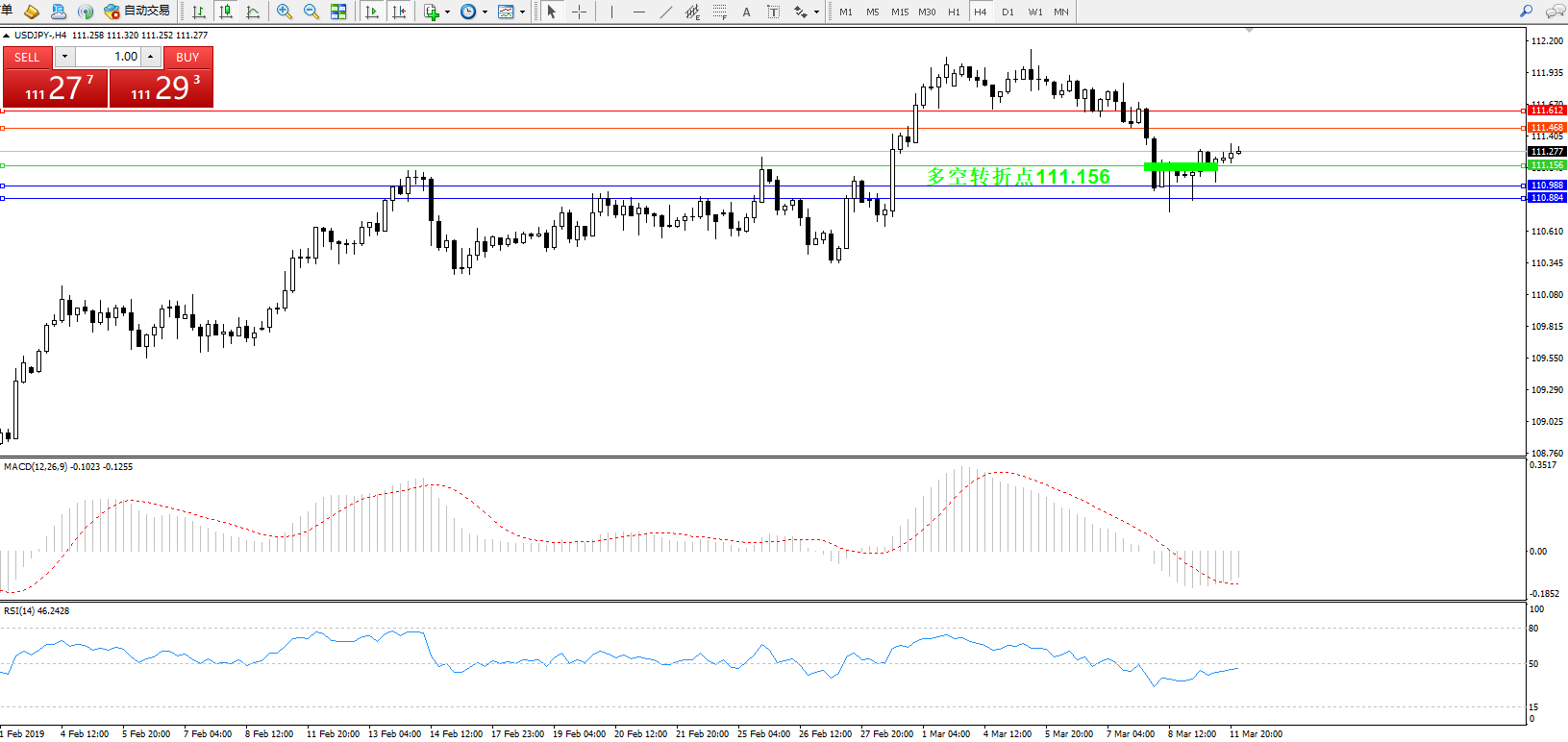 交易策略:111.156上方看涨,目标111.468、111.612