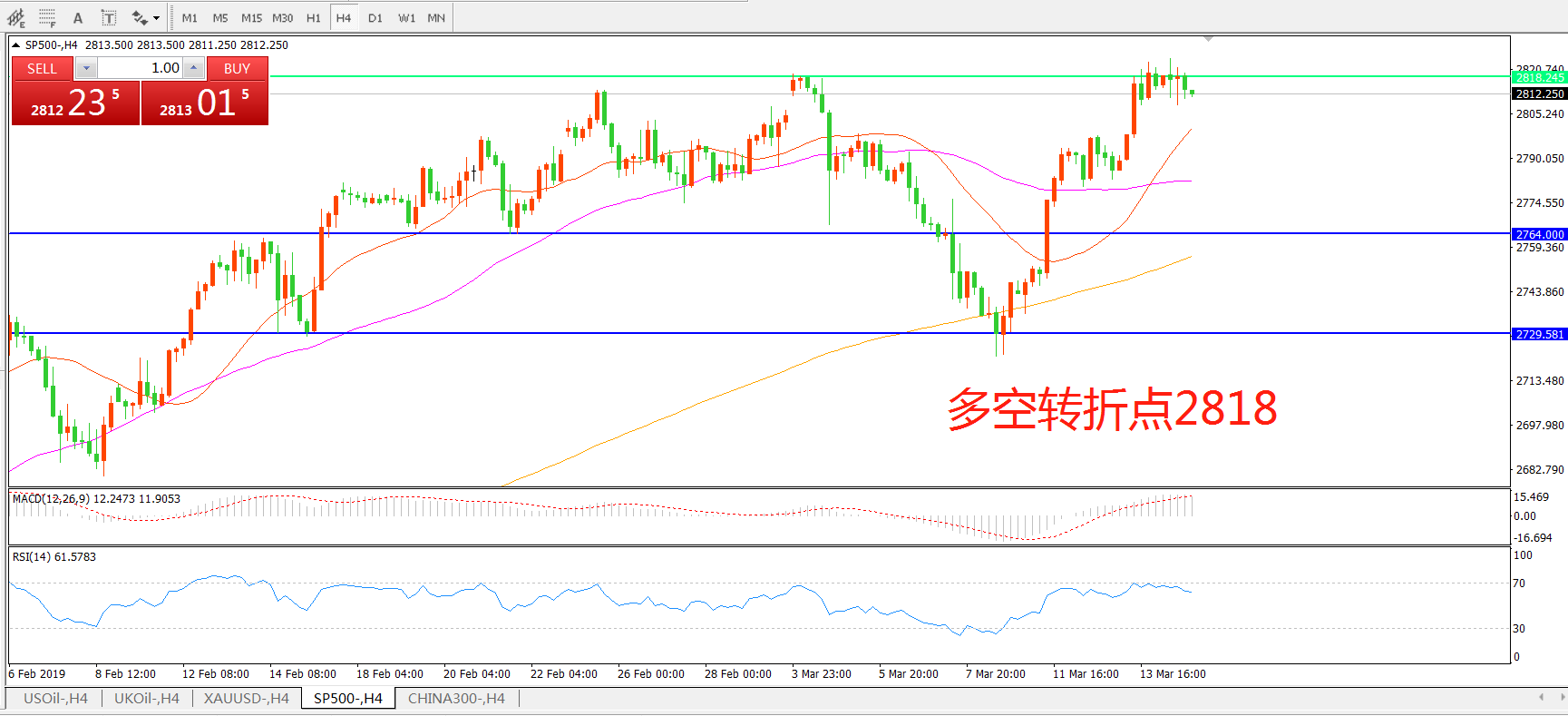 4小时图看,标普500触碰密集成交区后,高位出现回落,但价格整体维持在均线系统之上,M ACD红柱增加,RSI指标掉头上,日内宽幅震荡概率较大,重点关注2818一线得失。