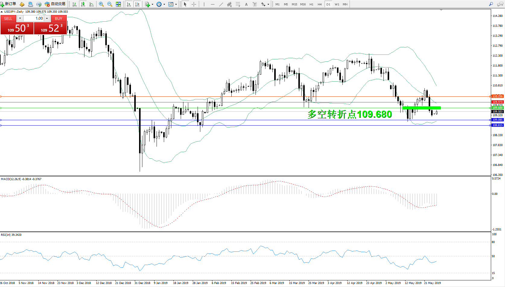 受助于日本投资者逢低吸纳;美日周一上涨,市场风险情绪略有回暖。日内初步计票数据显示欧洲议会选举并无太多意外状况,市场军心得以安定。而与英国脱欧紧密相关的市场顾虑情绪在上周五英国首相特雷莎·梅宣布辞职在即之后也稍有缓和。而美元指数在周一的重新企稳也带动了美日汇价回升,但是总体而言,日元下跌空间依旧有限,因为避险情绪在贸易问题持续发酵的背景下将始终挥之不去。日内美国总统特朗普出访日本期间,就国际贸易形势所放出的言论,也仍有待各方进一步品味解读。