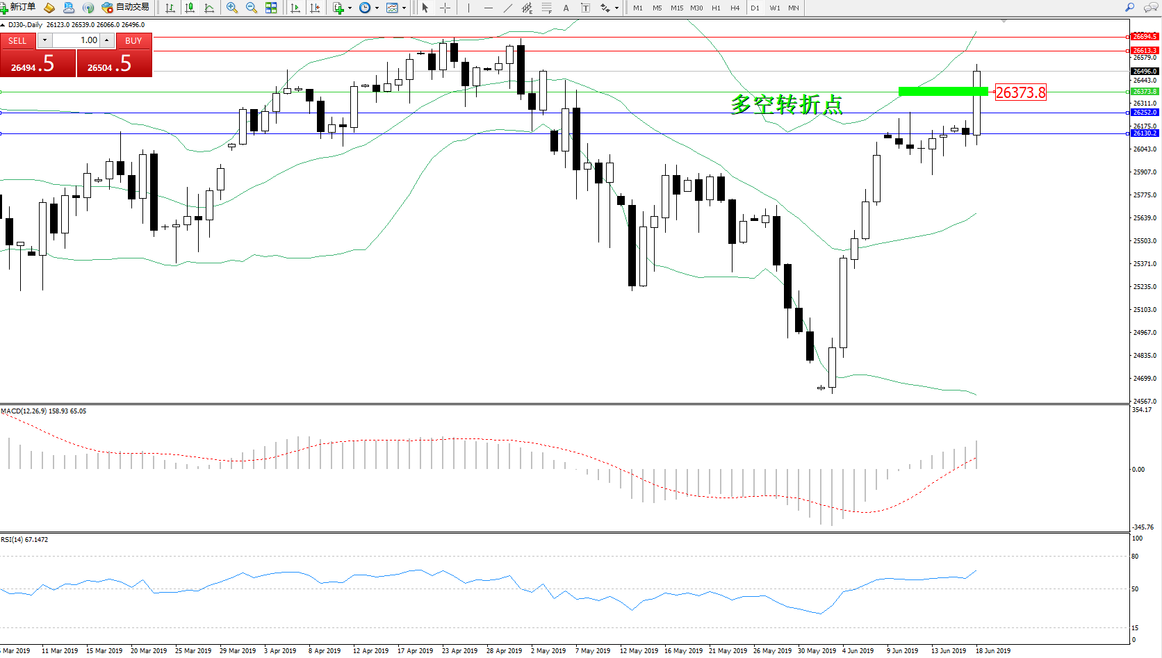 道琼斯指数618日(周二)收盘上涨353.00点,涨幅1.35%,报26465.54点。美国股市逼近历史高点,因市场乐观预期特朗普将缓和与中国的贸易紧张关系。受消息刺激,欧美股市大幅走高,道明证券驻多伦多大宗商品策略主管Bart Melek表示,我们看到风险偏好有所回升,股市走高,这扶助美元。全球央行新一轮的宽松竞赛已经全面起跑。如果美联储周三的政策决定不像市场预期的那样鸽派,美元就可能保持相对具有韧性的表现;目前市场预期本周约有20%的降息几率,是错误预期,预示着如果美联储让鸽派预期落空,将利好美元;美国经济仍处于“相对良好的状态”,关键变量是贸易不确定性导致的经济逆风;预计在20国集团峰会上会晤前,美联储将继续保持“观望”;然而,一旦美联储降息,美元就可能走弱;预计美联储将从9月开始以25个基点的速度降息,随后三个季度都会有下调,这将导致美元走软;情况可能类似于1998年,当时美国经济增速在超出潜在水平后放缓。