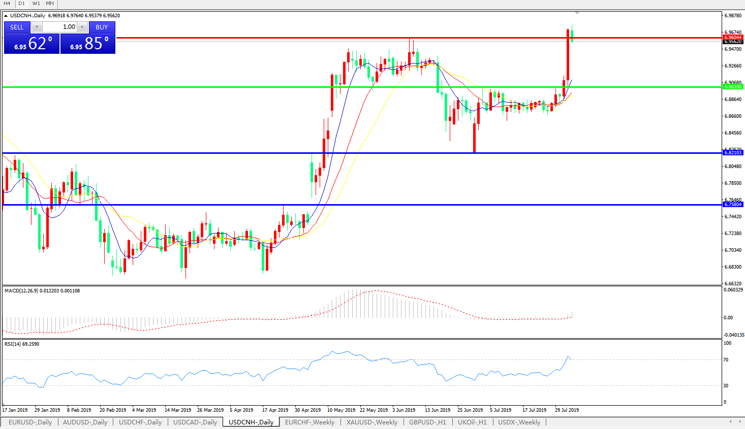 中美贸易谈判无进展,经贸磋商或长久延续,特朗普威胁在9月1日对中国3000亿产品加征关税,川普对国际贸易局势的相关言论,推送了市场的担忧情绪,再加上ISM制造业PMI数据放缓至近三年低点,美股大跌近1%再创一个月新低。美元人民币快速上攻,朝着7.0整数关口挺近。