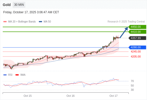 在 4280.00 之上,看涨,目标价位为 4410.00 ,然后为 4450.00 。
