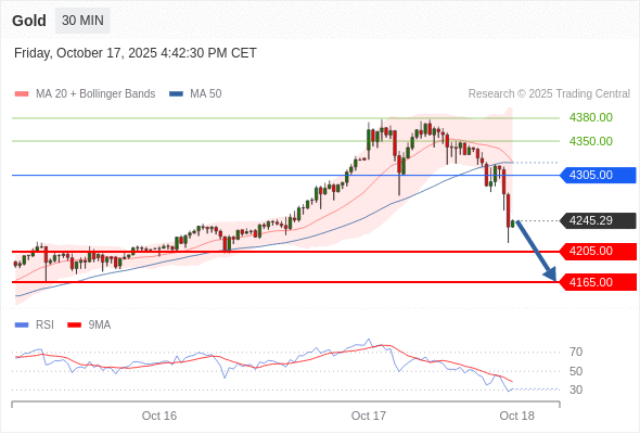 在 4305.00 之下,看跌,目标价位为 4205.00 ,然后为 4165.00 。