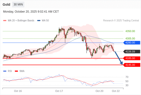 在 4280.00 之下,看跌,目标价位为 4185.00 ,然后为 4145.00 。