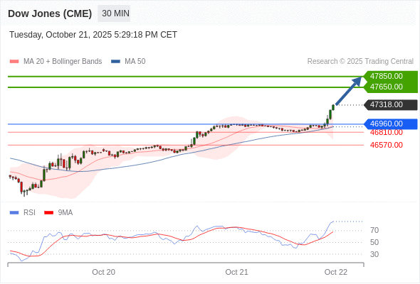 在 46960.00 之上,看涨,目标价位为 47650.00 ,然后为 47850.00 。