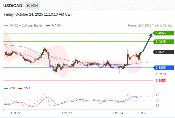 在 1.3985 之上,看涨,目标价位为 1.4045 ,然后为 1.4065 。