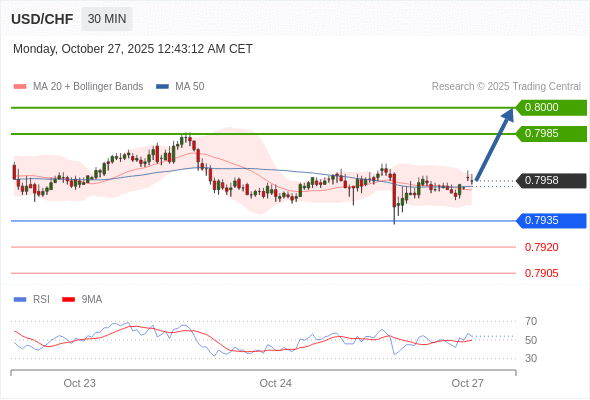 在 0.7935 之上,看涨,目标价位为 0.7985 ,然后为 0.8000 。