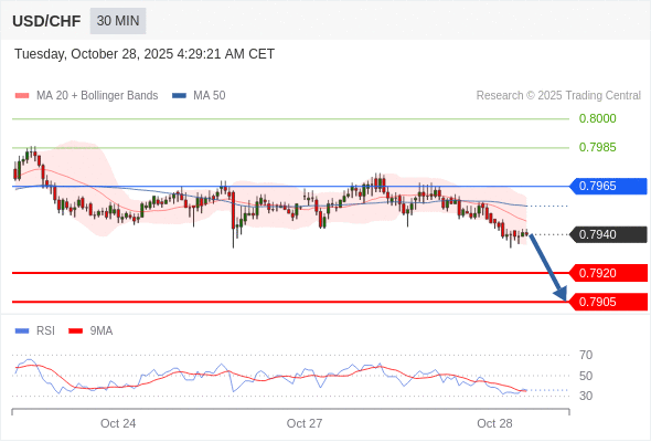 在 0.7965 之下,看跌,目标价位为 0.7920 ,然后为 0.7905 。