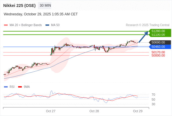 在 50460.00 之上,看涨,目标价位为 51100.00 ,然后为 51280.00 。
