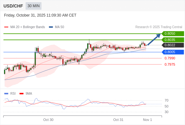 在 0.8005 之上,看涨,目标价位为 0.8035 ,然后为 0.8050 。