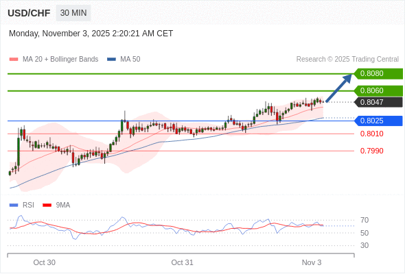 在 0.8025 之上,看涨,目标价位为 0.8060 ,然后为 0.8080 。