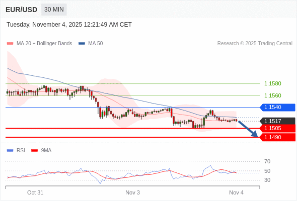 在 1.1540 之下,看跌,目标价位为 1.1505 ,然后为 1.1490 。