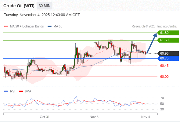 在 60.75 之上,看涨,目标价位为 61.50 ,然后为 61.80 。