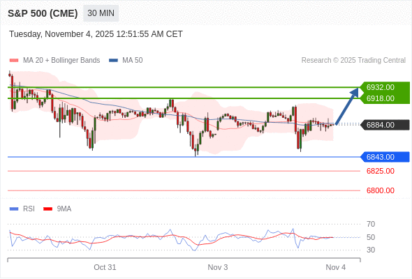 交易策略: 在 6843.00 之上,看涨,目标价位为 6918.00 ,然后为 6932.00 。