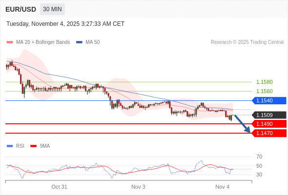 在 1.1540 之下,看跌,目标价位为 1.1490 ,然后为 1.1470 。