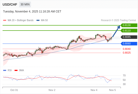 在 0.8060 之上,看涨,目标价位为 0.8110 ,然后为 0.8130 。