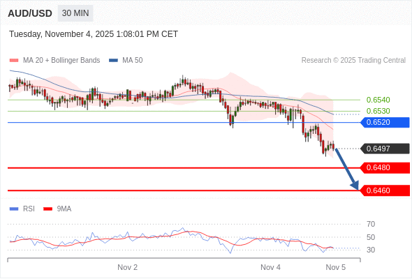 在 0.6520 之下,看跌,目标价位为 0.6480 ,然后为 0.6460 。