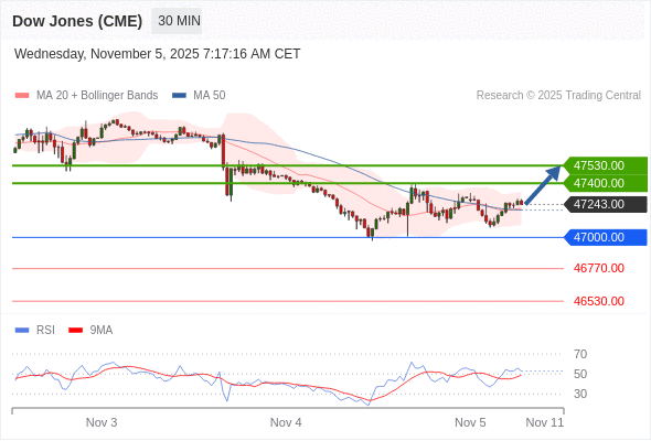 美国道琼斯指数期货 (Z5) 当日内: 在47000.00之上,看涨。