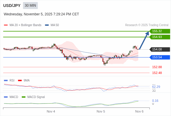 美元/日元 当日内 : 看涨,当 153.54 为支撑位。