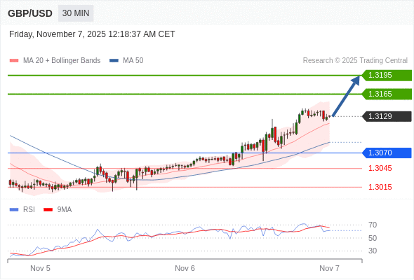 在 1.3070 之上,看涨,目标价位为 1.3165 ,然后为 1.3195 。