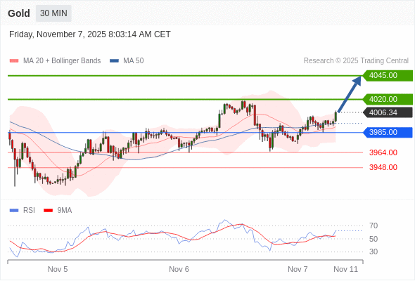 在 3985.00 之上,看涨,目标价位为 4020.00 ,然后为 4045.00 。