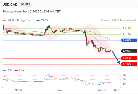 在 1.4075 之下,看跌,目标价位为 1.4000 ,然后为 1.3975 。