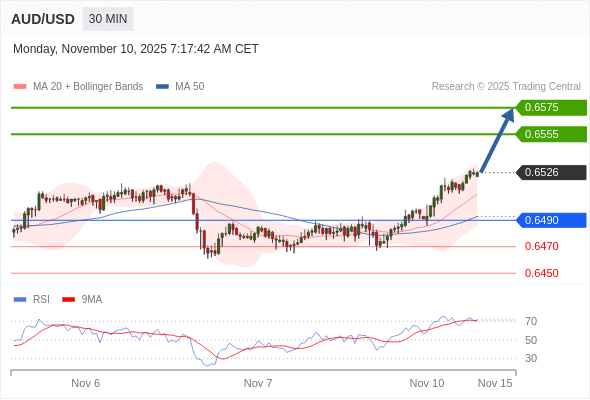 在 0.6490 之上,看涨,目标价位为 0.6555 ,然后为 0.6575 。