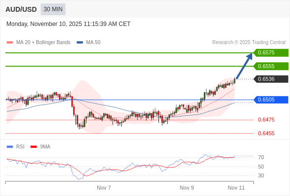 在 0.6505 之上,看涨,目标价位为 0.6555 ,然后为 0.6575 。