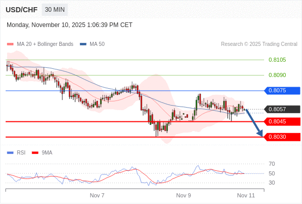 在 0.8075 之下,看跌,目标价位为 0.8045 ,然后为 0.8030 。