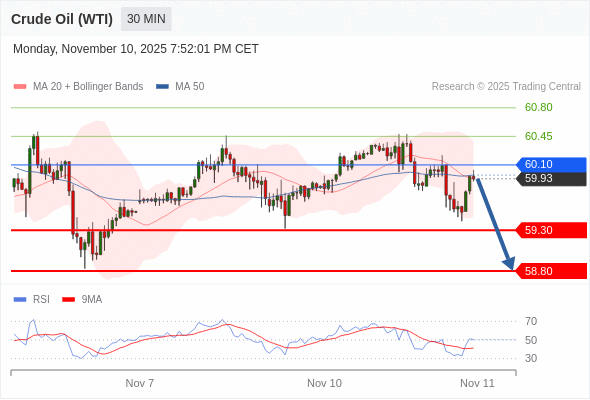 在 60.10 之下,看跌,目标价位为 59.30 ,然后为 58.80 。