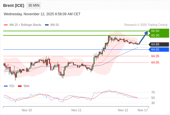 在 64.65 之上,看涨,目标价位为 65.30 ,然后为 65.50 。