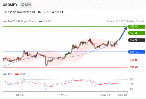 在 154.40 之上,看涨,目标价位为 155.30 ,然后为 155.60 。