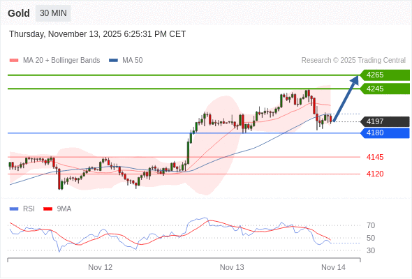 在 4180 之上,看涨,目标价位为 4245 ,然后为 4265 。