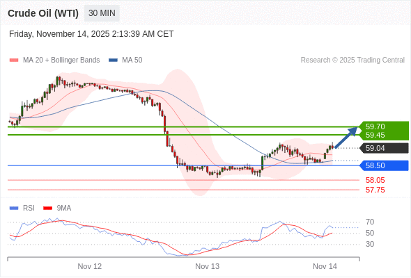 在 58.50 之上,看涨,目标价位为 59.45 ,然后为 59.70 。