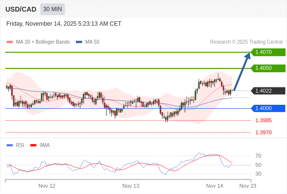 在 1.4000 之上,看涨,目标价位为 1.4050 ,然后为 1.4070 。