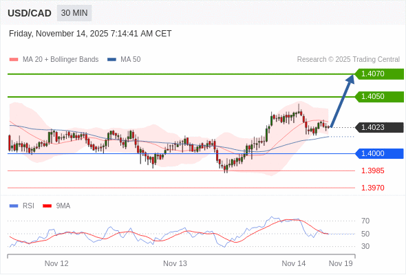 在 1.4000 之上,看涨,目标价位为 1.4050 ,然后为 1.4070 。