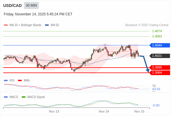 美元/加元 当日内 : 看跌,在 1.4044 之下。