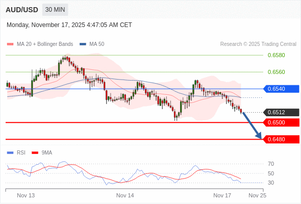 在 0.6540 之下,看跌,目标价位为 0.6500 ,然后为 0.6480 。