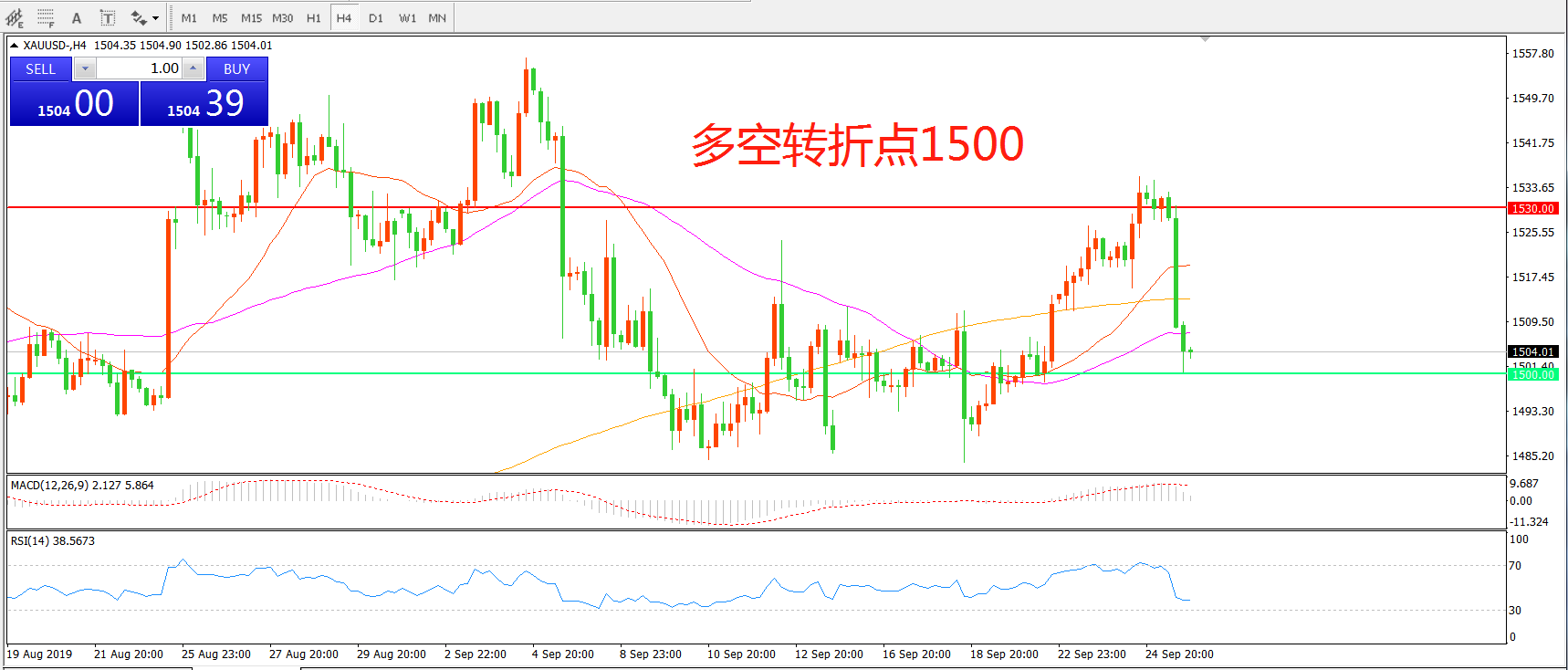 周三(9月25日),司法部公布的特朗普电话备忘录显示,特朗普称美国对乌克兰“非常好”,但没有直接提到外国援助,美元短线拉升逾30点,一举击穿99关口,现货金价自两周高位大幅回落30美元,收报1504.23美元/盎司。美国公布的8月季调后新屋销售数据表现强劲,给金价带来压力,连续多日上涨之后,金价多头集体平仓引发踩踏事故,加速了金价的下行。