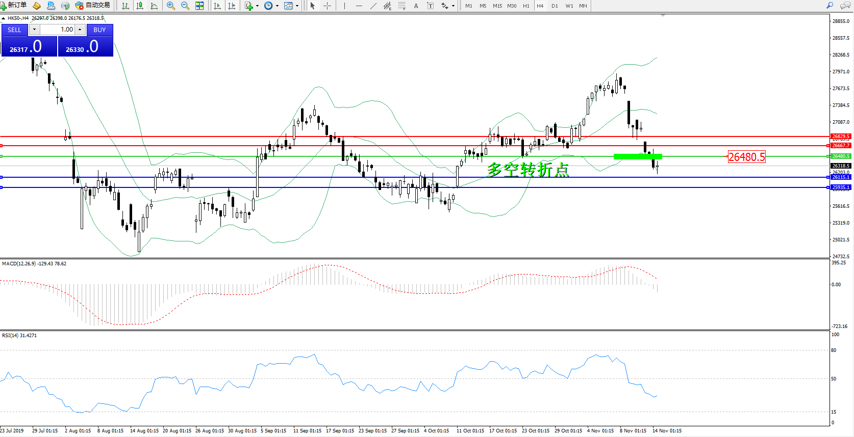 香港恒生指数11月14日(周四)收盘下跌247.77点,跌幅0.93%,报26323.69点;港股早上低开后反弹倒升,但仅升34点,恒指高见26605,随后再度下跌,最多跌285点,低见26286,更接近26000关口。鲍威尔明确表态,“只要经济保持增长走势,美联储不会在短期内调整利率”。美方透露出对第一阶段协议还存在分歧, 中美贸易磋商再次卡壳,投资者正在评估美联储主席鲍威尔的国会证词、美国国会针对特朗普弹劾调查案的首次公开听证会、以及国际贸易局势的进展。恒指失去最大利好预期的全市场可能又会开始回调,震荡。