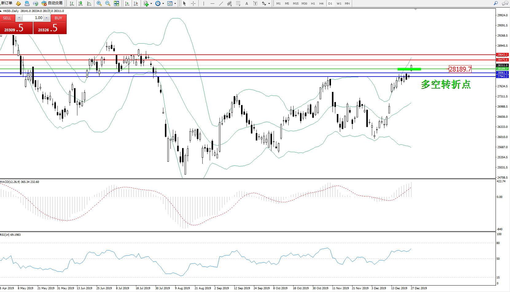 香港恒生指数12月27日(周五)收盘上涨361.21点,涨幅1.30%,报28225.42点;美国股市在圣诞假期后复市再续造好,由于中美双方明言已密切联系,正准备签署协议。消息刺激美股三大指数再度高开高收,并再创出52周历史新高。港股在假期后开市,跟随外围造好而高开169点,恒指直冲上28033,曾收窄升幅至近28000关口。唯有买盘支持,未有跌穿28000关口,并再向上扩大升幅,高见28226,并创出近6个月高位。 在情绪没有恶化,市场尚无消息改变趋势的前提下,港股可能会有一波行情,这是多方努力的结果。