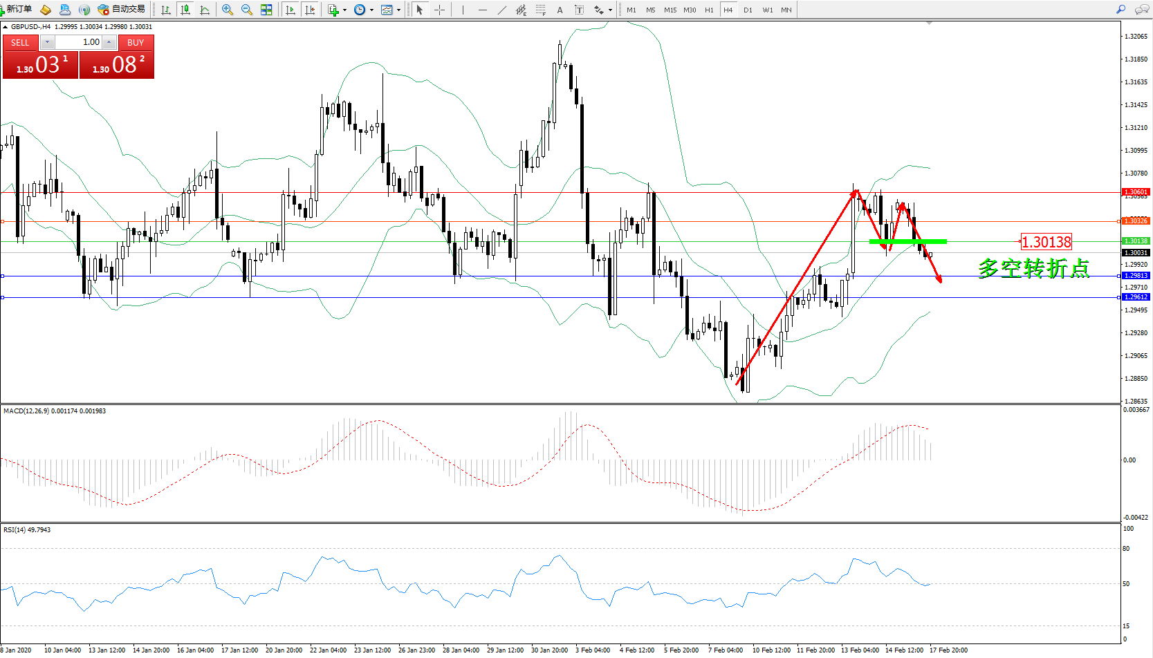 交易策略:1.30138下方看跌,目标1.29813、1.29612