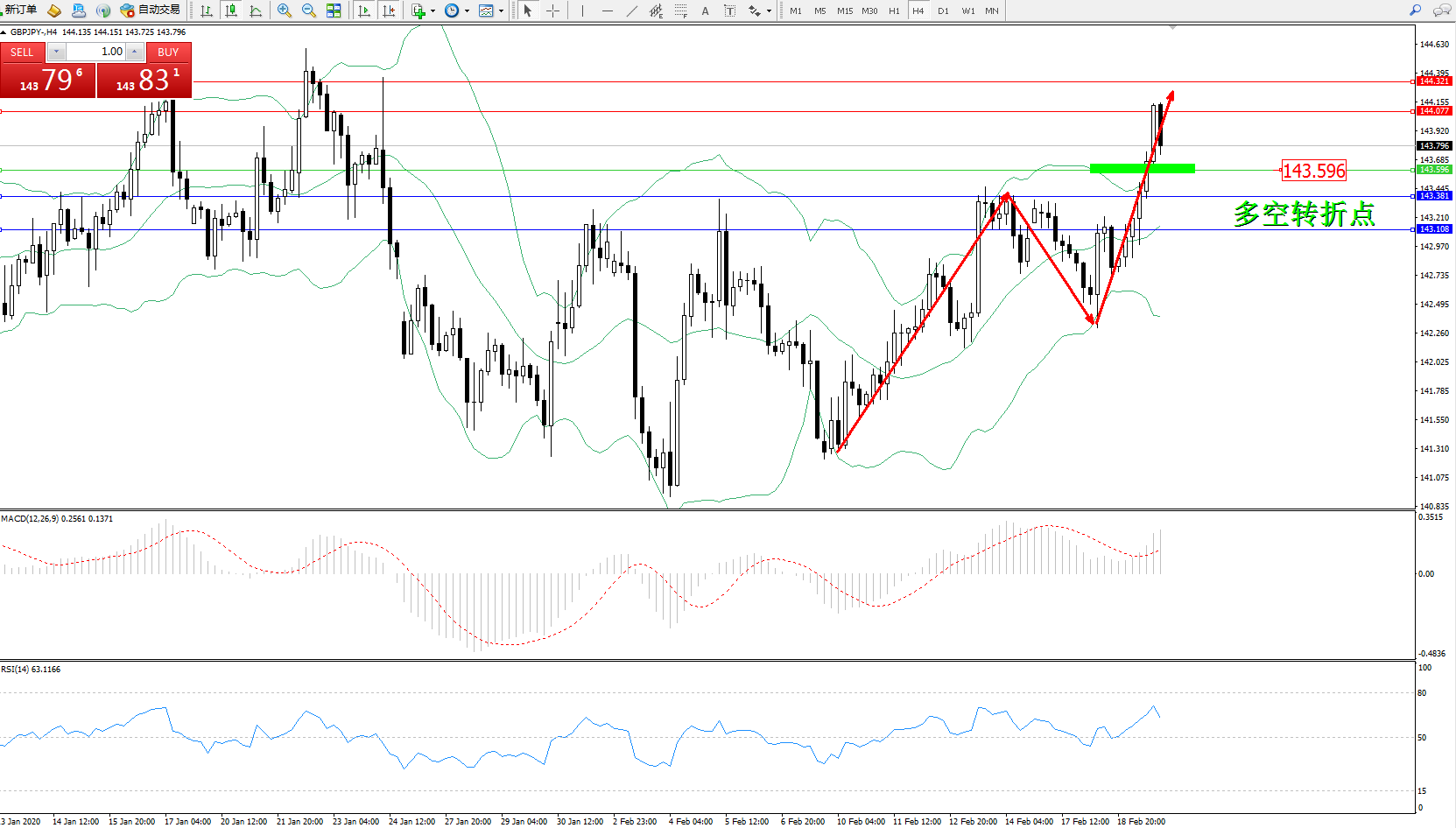 交易策略:143.596上方看涨,目标144.077、144.321