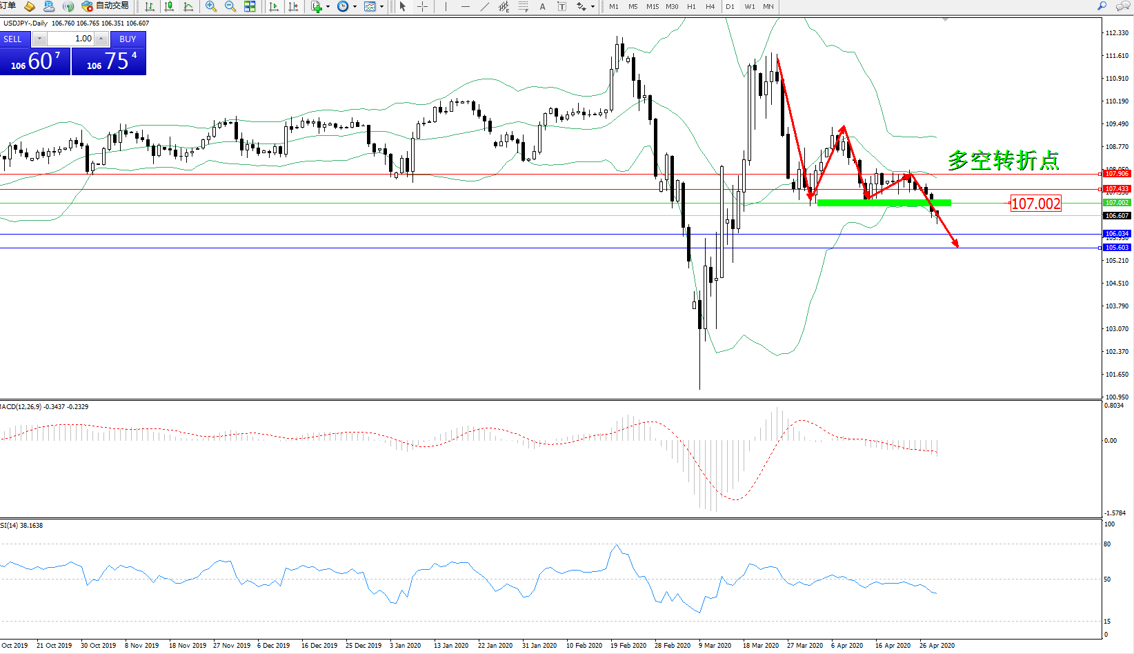 美元兑日元跌0.18%至106.68,连续第六天下跌;因美元指数日内仍在继续承压,美国一季度GDP数据标志着经济衰退开始,美联储维持利率在0%-0.25%区间不变,将维持利率在低位,直至美联储有信心通胀能回归正轨。美元兑日元日内料进一步跌向106.25这一关键支撑水平,一旦失守,将进一步下破106关口,而仅有在收复了106.90,并进一步上破107.05之后,短线的加速下行趋势才能得到扭转。同时,由于日本从周三起即进入了“黄金周”公共假期,因此美元兑日元走势后市将更多受到美元指数自身波动的影响,日元与其他非美货币的关联度将提升。