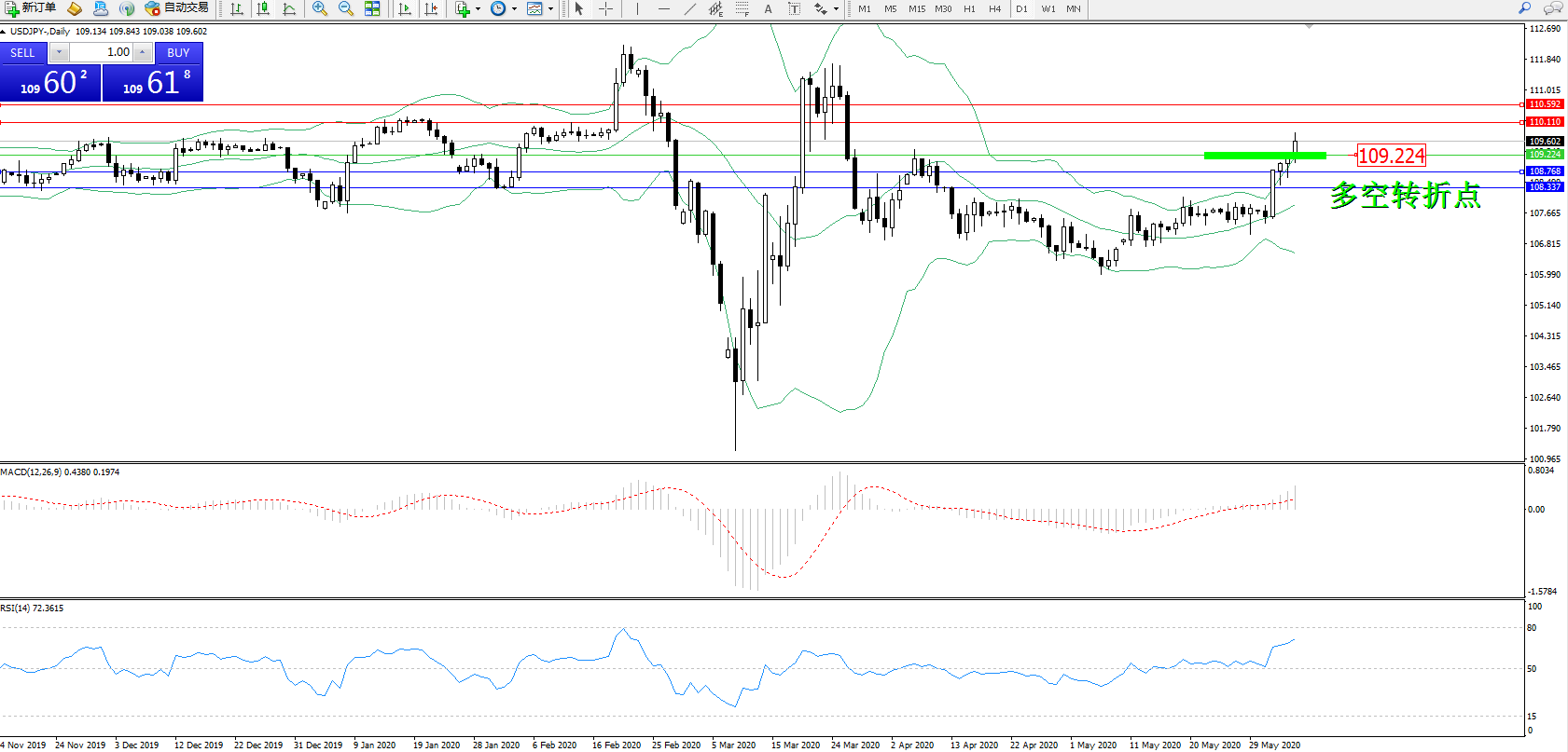 美元兑日元上涨0.4%至109.59;稍早触及3月26日以来高点109.85。美国劳工部的就业报告显示,5月份失业率从4月触及的二战后最高水平14.7%降至13.3%。此前的调查显示,消费者信心、制造业和服务业都在企稳。3月中为减缓疫情蔓延而关闭的企业现已重新开业,经济状况明显改善。美国的就业数据好于预期,市场接下来的反应是对美国经济增长好转的预期,以及收益率曲线趋陡,资金继续流出避险资产,全球股市继续走高,而美债收益率则继续攀升,反映市场预期已经转为乐观情绪。