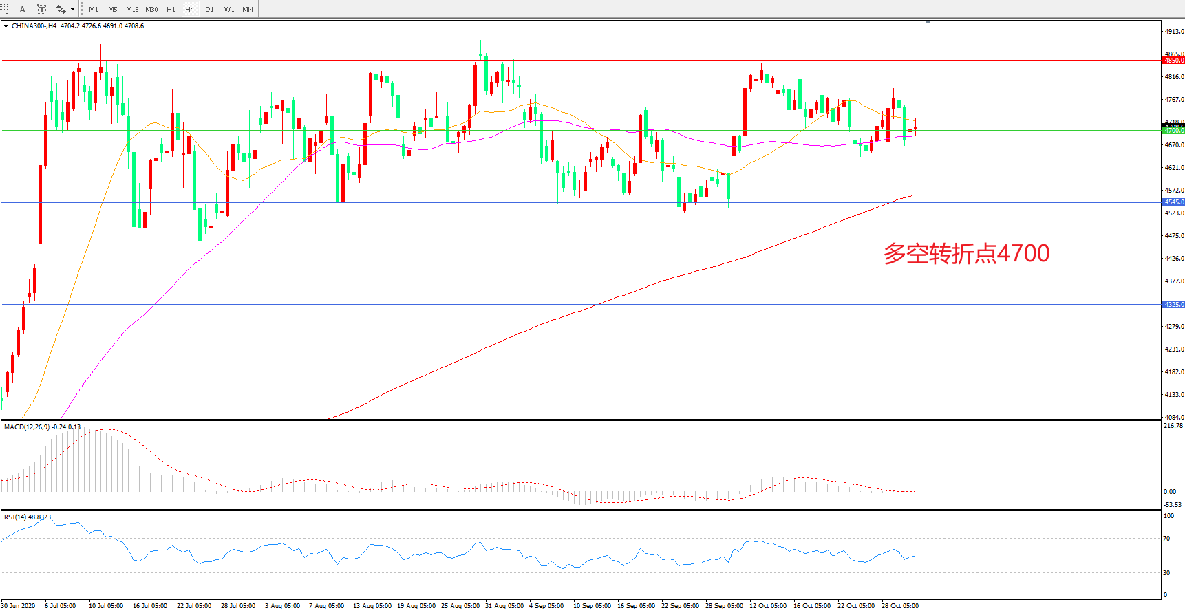 4小时图看,沪深300延续窄幅震荡,短期波幅不大,反弹高点逐渐降低, 55周期均线成为下方支撑,MACD红柱缩短,RSI指标走平,日内延续震荡概率较大。