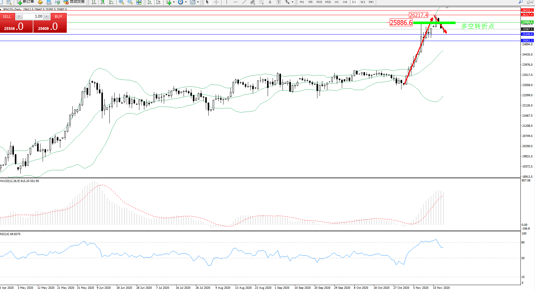 技术点评:多头动力延续布林带指标上轨附近持续震荡上扬态势良好,高位抵达26217位置附近节点后遇阻出现反转回撤下移走势,布林带指标呈张口走势后开始收口,高位空头动力有伺机入场态势,MACD指标处于多头区域强势拉升上扬后,开始平缓整理,RSI指标纠结于80均衡线附近弱势震荡后开始回撤下移中;