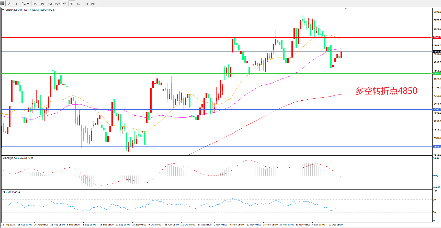 4小时图看,沪深300以4850为依托小幅反弹,短期表现有所回暖,区间震荡迹象明显,55周期均线成为上方阻力,MACD红柱减少,绿柱增加,RSI指标向上,日内延续震荡概率较大。