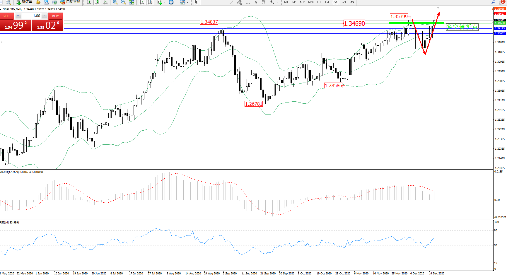 交易策略:1.34690上方看涨,目标1.35627、1.36098